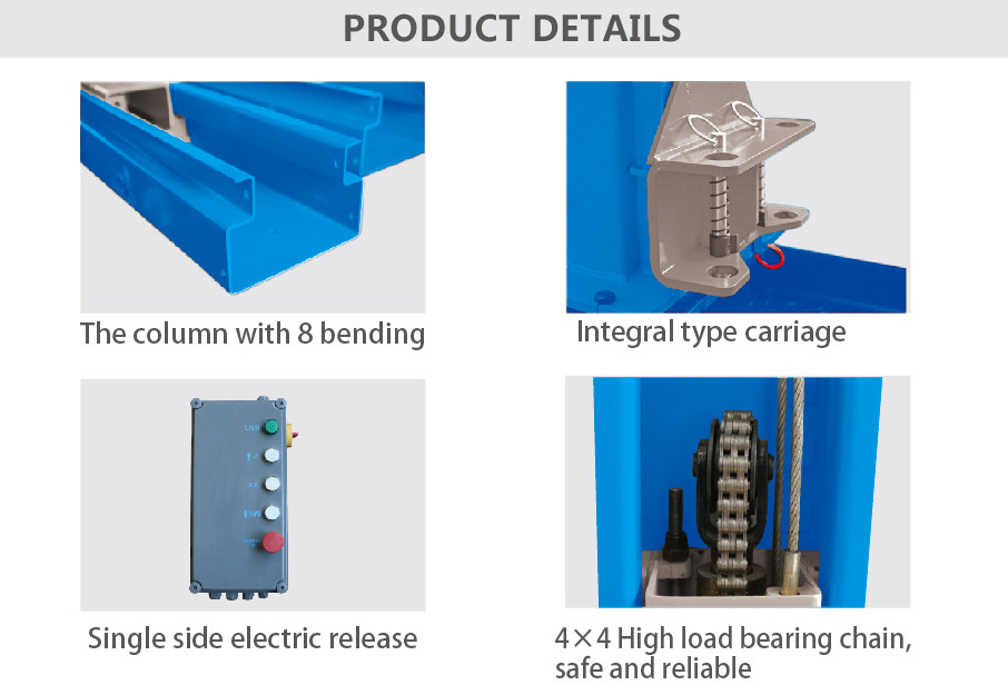 Çift silindirli sürüş, dengeli kaldırma, çift sigortalı kendinden kilitlemeli koruma cihazı, basit ve güvenli çalışmaya sahiptir.