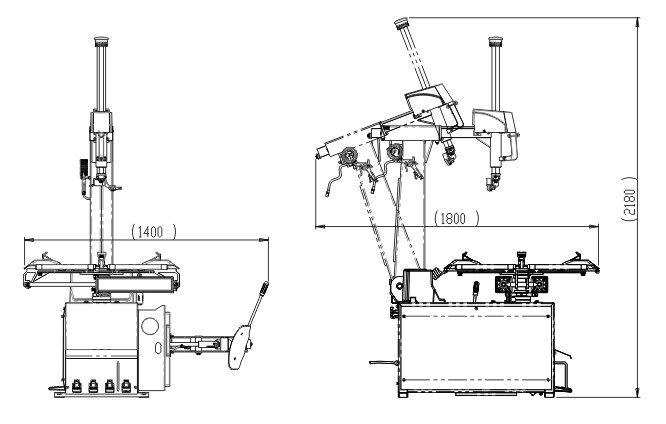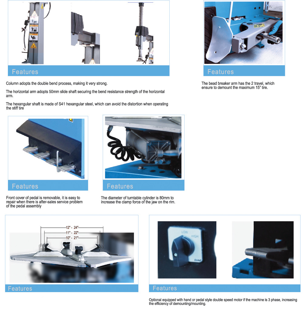 1) Otomatik lastik değiştirici, kolonun öne ve arkaya yatırılması ve kolonun kilitlenmesi pnömatik olarak tamamlanabilir.