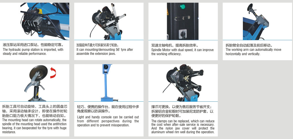 3) Takım otomatik olarak dönebilir.Montaj kafasındaki mil, rulman tasarımı kullanır, büyük dirençli lastik için kullanılabilir.